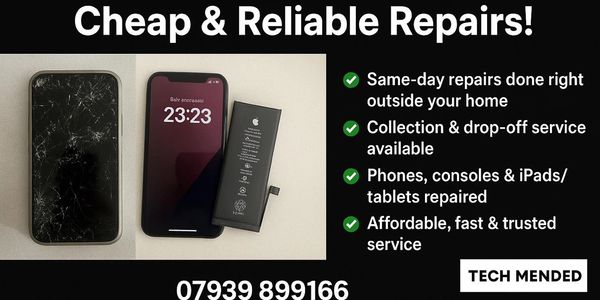 Techmended is your trusted local repair specialist, offering fast, affordable, and reliable fixes for phones, tablets, iPads, and gaming consoles. We pride ourselves on convenience and quality, providing collection and drop-off services, as well as postal repairs for customers further away. As we’re a home-run and mobile business (offering repairs right on your doorstep), we don’t have fixed opening hours — we’re open 24/7 by appointment only, so feel free to book your repair at any time that suits you! With 90% of repairs completed the same day, we make sure you’re never without your device for long. Our commitment to customer satisfaction speaks for itself — we proudly hold a 100% recommendation rate across Facebook and Google reviews. At Techmended, we don’t just fix devices — we restore your connection to what matters most.